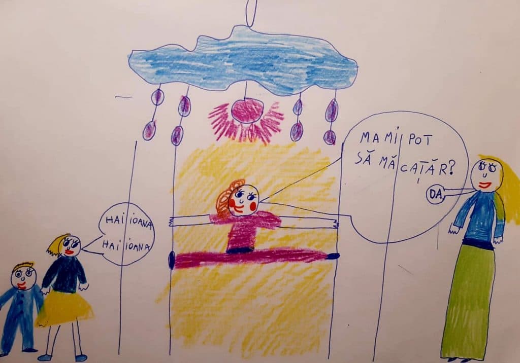 Am fost curioasă să aflu și ce își doresc copiii de acest Crăciun și i-am întrebat pe copiii prietenei mele, care are și ea tot trei 🙂 (Da! Și am fost însărcinate cam în același timp!) ce au trecut în lista de dorințe. Ioana, fetița de 7 ani, mi-a spus așa: “vreau să nu mai fiu niciodată certată, chiar dacă fac prostioare, și îmi doresc să am voie să mă cațăr oriunde“. Și-a pus dorința și într-un desen, care tare m-a amuzat.